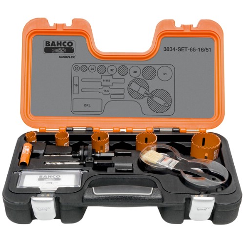 3834-SET-87 Hålsågssats med åtta av de vanligaste hålsågarna för arbeten inom verkstad, VVS och elinstallation. Innehåller hålsågar: 19, 22, 29, 38, 43, 48, 52, 65 mm, hållare 3834-ARBR-930 och 3834-ARBR-9100, borr 3834-DRL och fjäder 3834-ES.